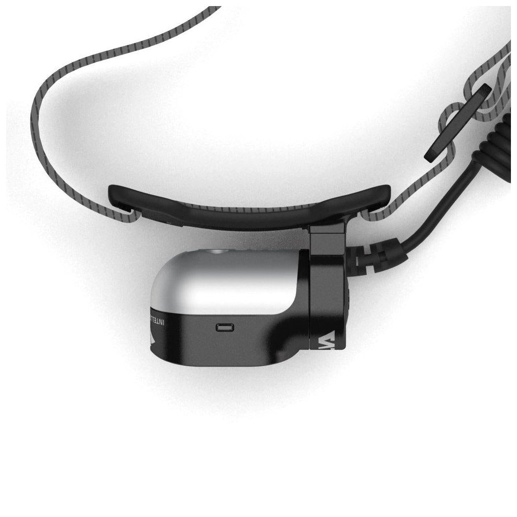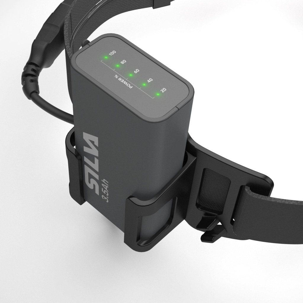 Included is a powerful USB-C Li-Ion rechargeable battery with a capacity of 25.9Wh, weighing 129g, and a charge status indicator. Batteries of 14.8Wh, 51.8Wh, and 77.7Wh can be purchased separately. Using the extension cable, the power source can be stored in a backpack, waist bag, or running vest, which is appreciated during longer activities when the headband with the lamp, weighing only 78g, will not restrict you. In sub-zero temperatures, you can extend the battery life by placing it in warmth under your jacket using the cable. The light output is regulated by a built-in temperature sensor according to the surface temperature of the lamp. When the battery capacity drops to 10% of the initial value, the headlamp switches to reserve mode, indicated by blinking for 1 second, with at least 30 minutes of operation remaining at the lowest power.