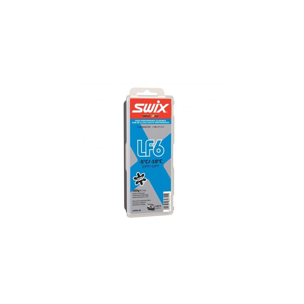 SWIX LF6 is a highly versatile glide wax for skis, suitable for use alone or as a base for SWIX HF6 and SWIX Cera F powders. SWIX LF06X is highly durable and performs excellently on artificial snow. When used as a base for SWIX Cera F, we recommend applying SWIX FC06X powder.