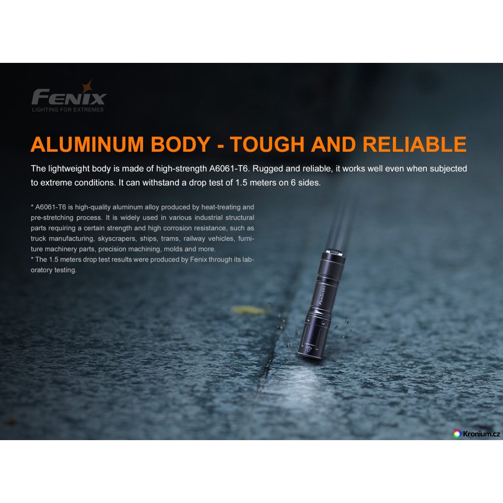 Druhá generace oblíbené mini svítilny Fenix E01 V2.0 nabízí tři režimy výkonu se světelným tokem až 100 lumenů (ANSI). Díky zanedbatelným rozměrům je ideálním zástupcem kategorie EDC (Every Day Carry), lze ji nosit stále při sobě, ať už v kapse, na klíčích či v peněžence. Svítilna není o moc větší než mikrotužková AAA baterie, ze které je napájena. Samozřejmostí je vysoká kvalita provedení, odolnost a vodotěsnost. Ultra tenký kolimátor vytváří široký světelný kužel s dosvitem až 35 metrů. Svítilna je svými vlastnostmi předurčena, aby sloužila jako malý spolehlivý společník, který je vždy při ruce. S tímto užitečným dárkem uděláte vždy radost.