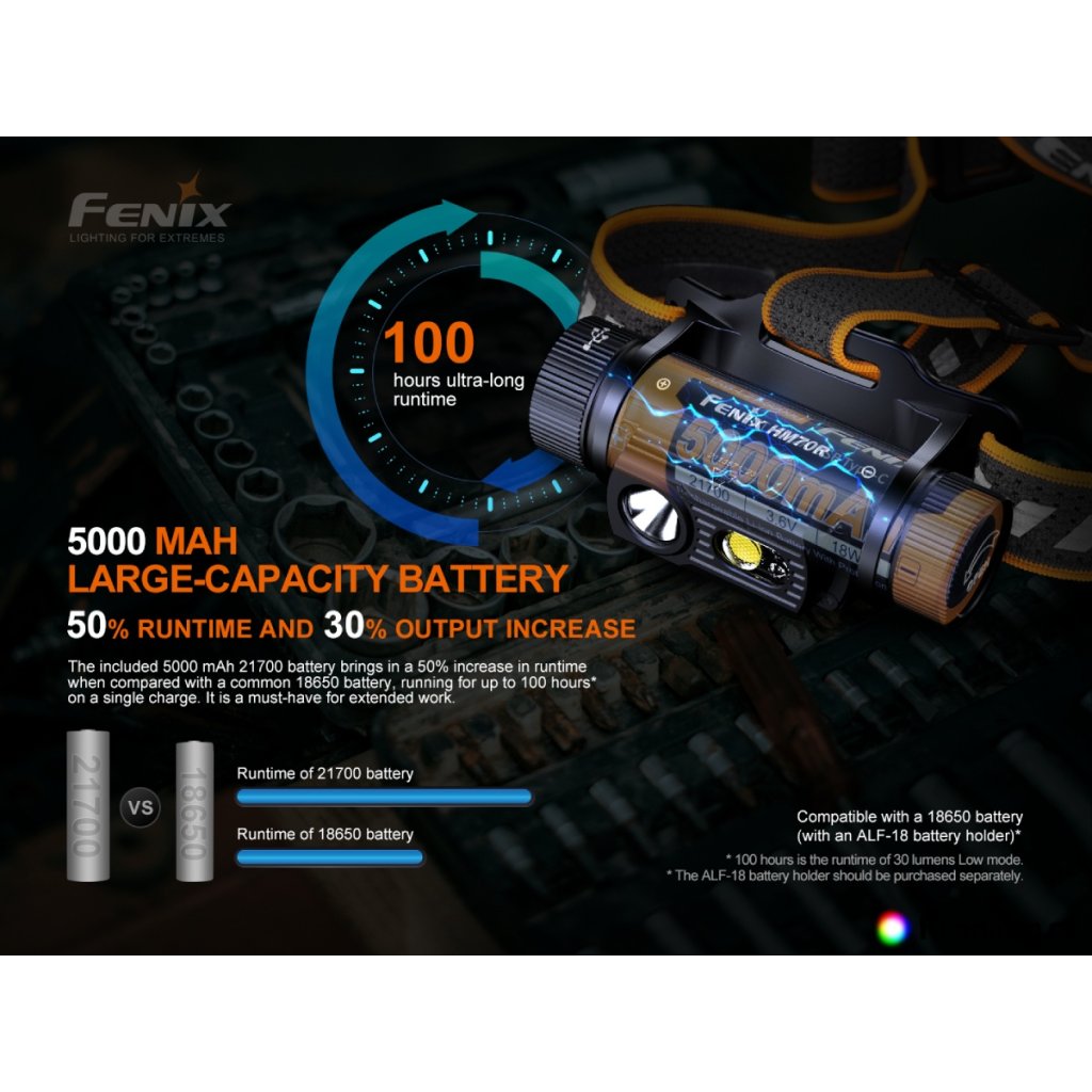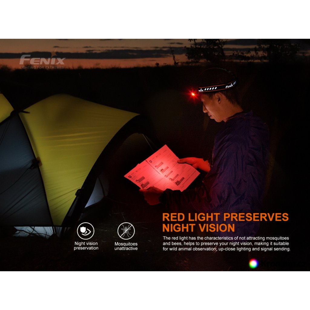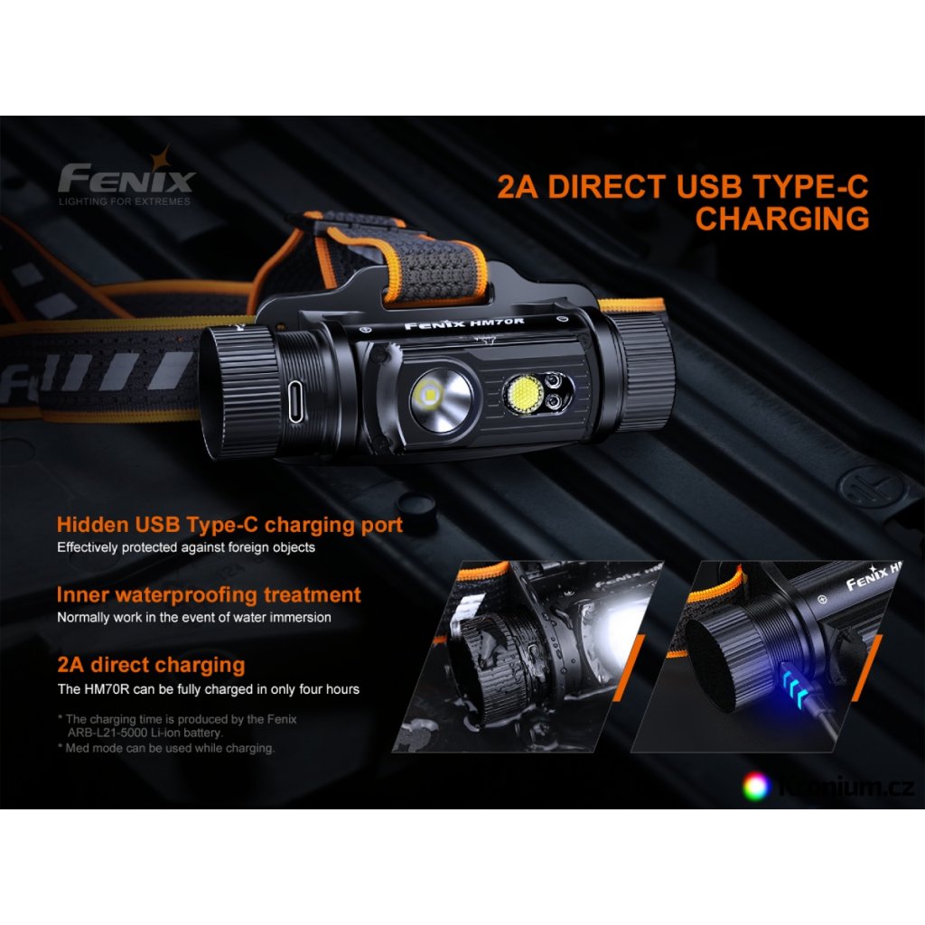 Fenix HM70R je extrémně výkonná nabíjecí čelovka, která nabízí světelný tok až 1600 lumenů. Součástí balení je i nabíjecí Li-ion akumulátor typu 21700 s kapacitou 5000 mAh, který se nabíjí přímo v čelovce přes USB-C konektor. Čelovka je osazena více světelnými zdroji, v dálkovém reflektoru se nachází LED Luminus SST-40, která dosvítí až na vzdálenost 186 metrů. V druhém širokém reflektoru je osazena LED Cree XP-G2 HE s teplejším odstínem (neutral white) o výkonu 400 lumenů, která má světelnou stopu velmi širokou a plynulou. Čelovka disponuje navíc i červeným světlem s výkonem 5 lumenů. S touto barvou je schopna svítit na nejnižší režim téměř 17 dní a dovede nepřetržitě blikat přes 33 dní.