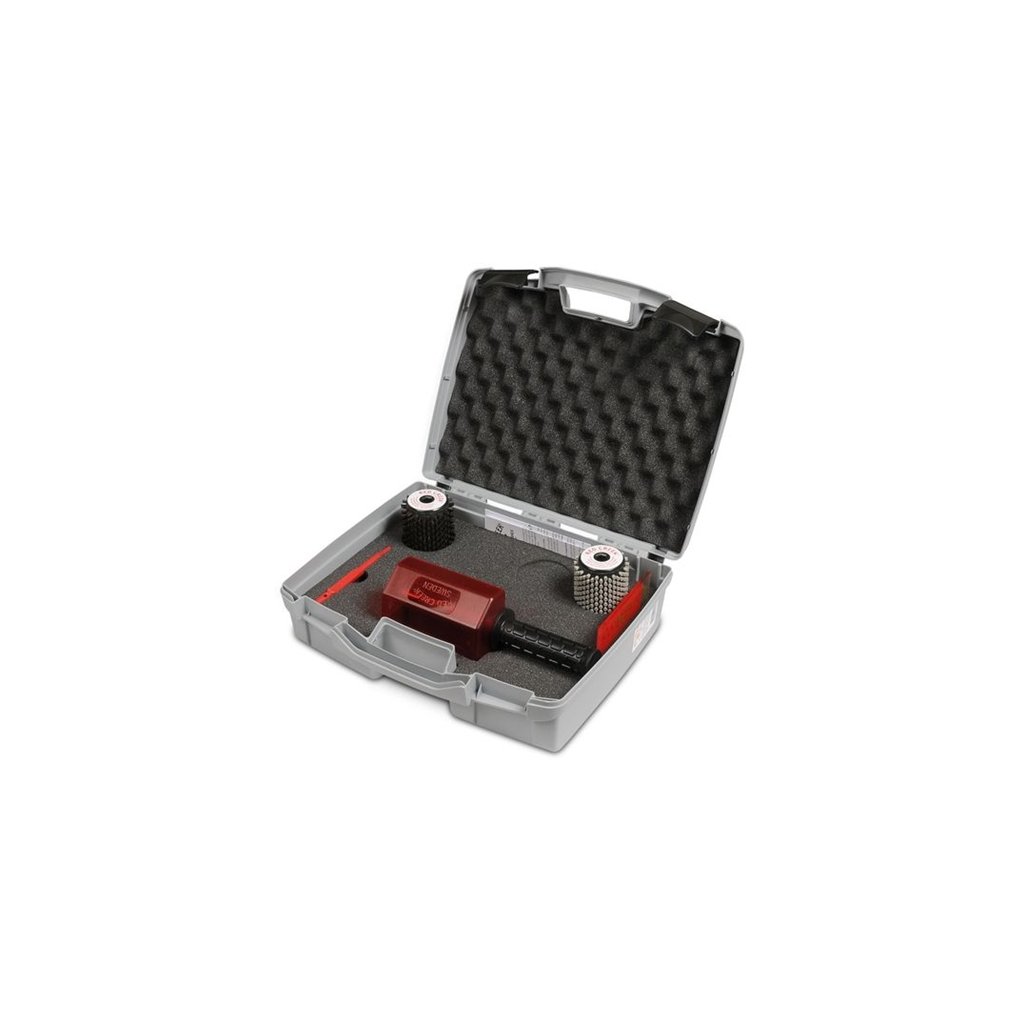 Walizka z dwoma obrotowymi szczotkami, każda o szerokości 100mm, oraz akcesoriami (uchwyt do szczotek obrotowych 100mm, skrobak - Scraper Pro Diamond 5mm i skrobak do rowków).