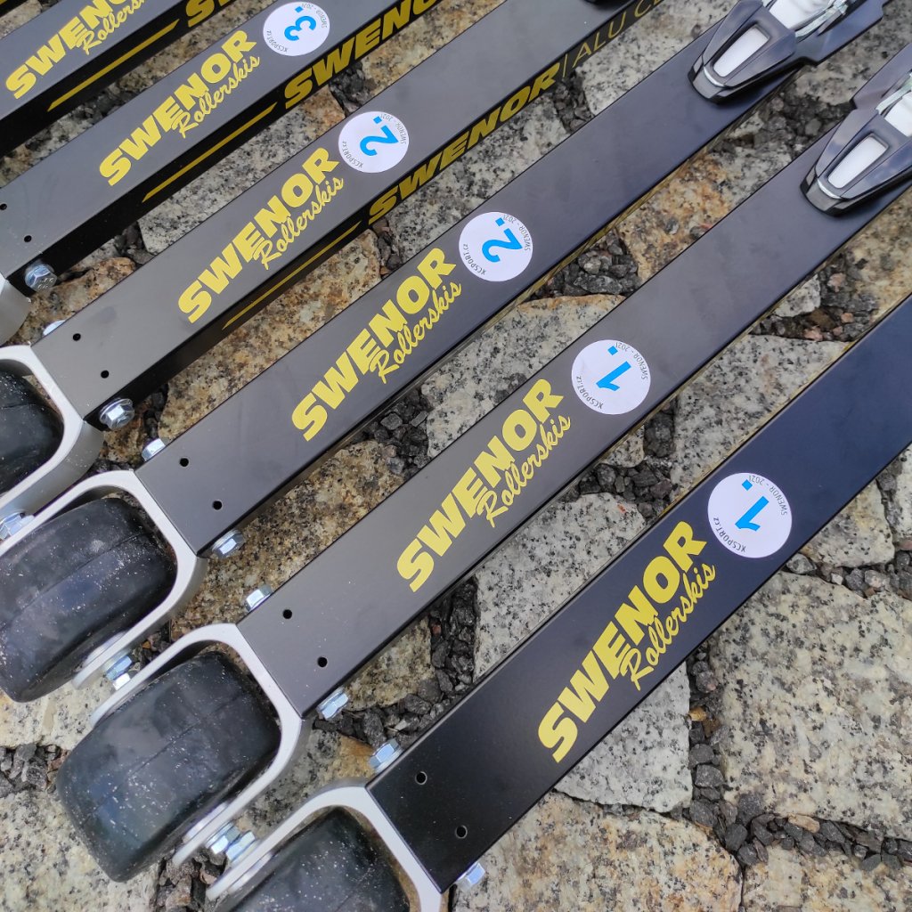 Ľahké klasické tréningové kolieskové lyže s hliníkovým profilom a gumovými kolieskami. Všetky tréningové lyže SWENOR sú štandardne dodávané s pomalými kolieskami #3.