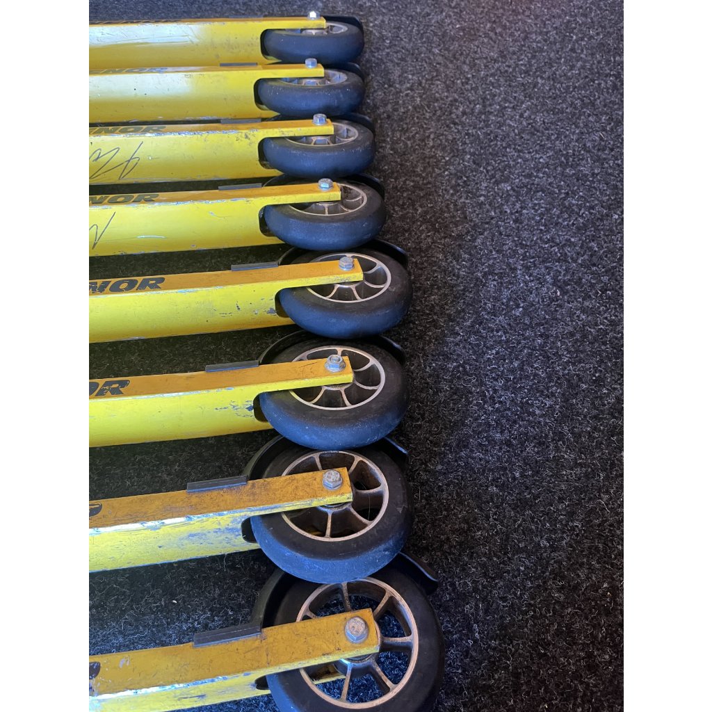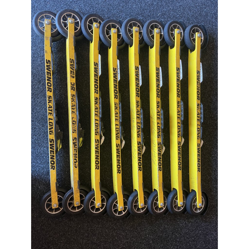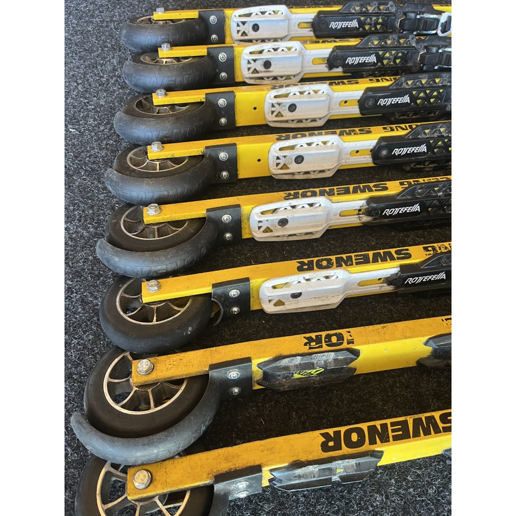 Použité tréninkové kolečkové lyže pro bruslařskou techniku s hliníkovým profilem a kvalitními gumovými kolečky, které velmi věrně simulují pohyb na sněhu. Vhodné pro pokročilé i závodní lyžaře při letní přípravě.